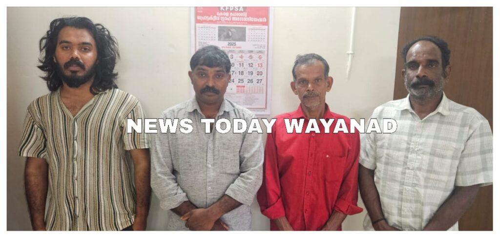 മൂടക്കൊല്ലി സ്വദേശികളായ പഴമ്പിള്ളിയിൽ വീട് അനിൽ മാവത്ത്, റോമോൻ, എള്ളിൽ വീട് വർഗീസ്, കള്ളിയാട്ട് കുന്നേൽ വീട് വിഷ്ണു ദിനേശ് എന്നിവരെയാണ് ചെതലത്ത് റേഞ്ച് ഫോറെസ്റ്റ് ഓഫീസർ എം.കെ രാജീവ് കുമാർ അറസ്റ്റ് ചെയ്തത്. നാടൻ തോക്ക്, കാർ, കാട്ടാടിന്റെ ജഡം എന്നിവയും കണ്ടെടുത്തു. രണ്ടു മാസത്തിനിടെ ഈ മേഖലയിൽ നിന്നും കള്ള തോക്കുമായി പിടികൂടുന്ന രണ്ടാമത്തെ കേസ് ആണിത്.