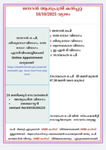 ബത്തേരി, മാനന്തവാടി, കൽപ്പറ്റ, വൈത്തിരി, കോഴിക്കോട് ആശുപത്രികളിലെ ഇന്നത്തെ ( 16.10.2025 – വ്യാഴം ) പ്രധാന ഒ.പി വിവരങ്ങൾ