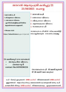 ബത്തേരി, മാനന്തവാടി, കൽപ്പറ്റ, വൈത്തിരി, കോഴിക്കോട് ആശുപത്രികളിലെ ഇന്നത്തെ ( 21.10.2025 – ചൊവ്വ ) പ്രധാന ഒ.പി വിവരങ്ങൾ
