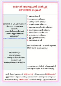 ബത്തേരി, മാനന്തവാടി, കൽപ്പറ്റ, വൈത്തിരി, കോഴിക്കോട് ആശുപത്രികളിലെ ഇന്നത്തെ ( 22.10.2025 – ബുധൻ ) പ്രധാന ഒ.പി വിവരങ്ങൾ