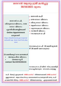 ബത്തേരി, മാനന്തവാടി, കൽപ്പറ്റ, വൈത്തിരി, കോഴിക്കോട് ആശുപത്രികളിലെ ഇന്നത്തെ ( 30.10.2025 – വ്യാഴം ) പ്രധാന ഒ.പി വിവരങ്ങൾ