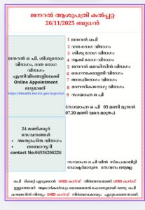 ബത്തേരി, മാനന്തവാടി, കൽപ്പറ്റ, വൈത്തിരി, കോഴിക്കോട് ആശുപത്രികളിലെ ഇന്നത്തെ ( 26.11.2025 – ബുധൻ ) പ്രധാന ഒ.പി വിവരങ്ങൾ