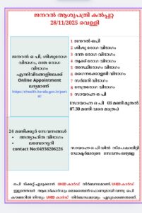 ബത്തേരി, മാനന്തവാടി, കൽപ്പറ്റ, വൈത്തിരി, കോഴിക്കോട് ആശുപത്രികളിലെ ഇന്നത്തെ ( 28.11.2025 – വെള്ളി ) പ്രധാന ഒ.പി വിവരങ്ങൾ