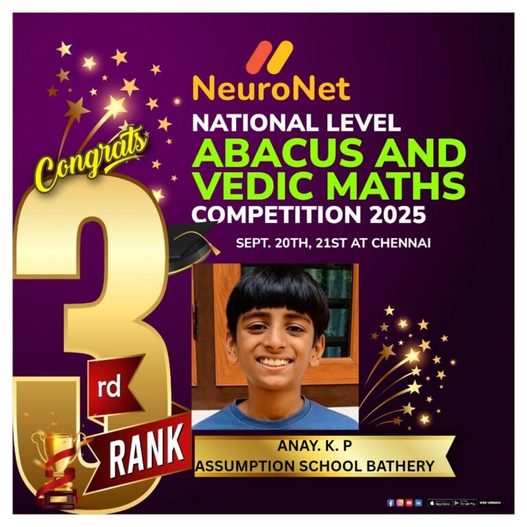 അമ്പലവയൽ : ചെന്നൈയില് നടന്ന അബാക്കസ് ദേശീയതല മത്സരത്തില് ലെവല് ഒന്നില് അമ്പലവയല് പായകൊല്ലി ന്യൂറോനെറ് സെന്ററിലെ അനയ് കെ.പി 98% മാര്ക്കോടെ മൂന്നാം റാങ്ക്...